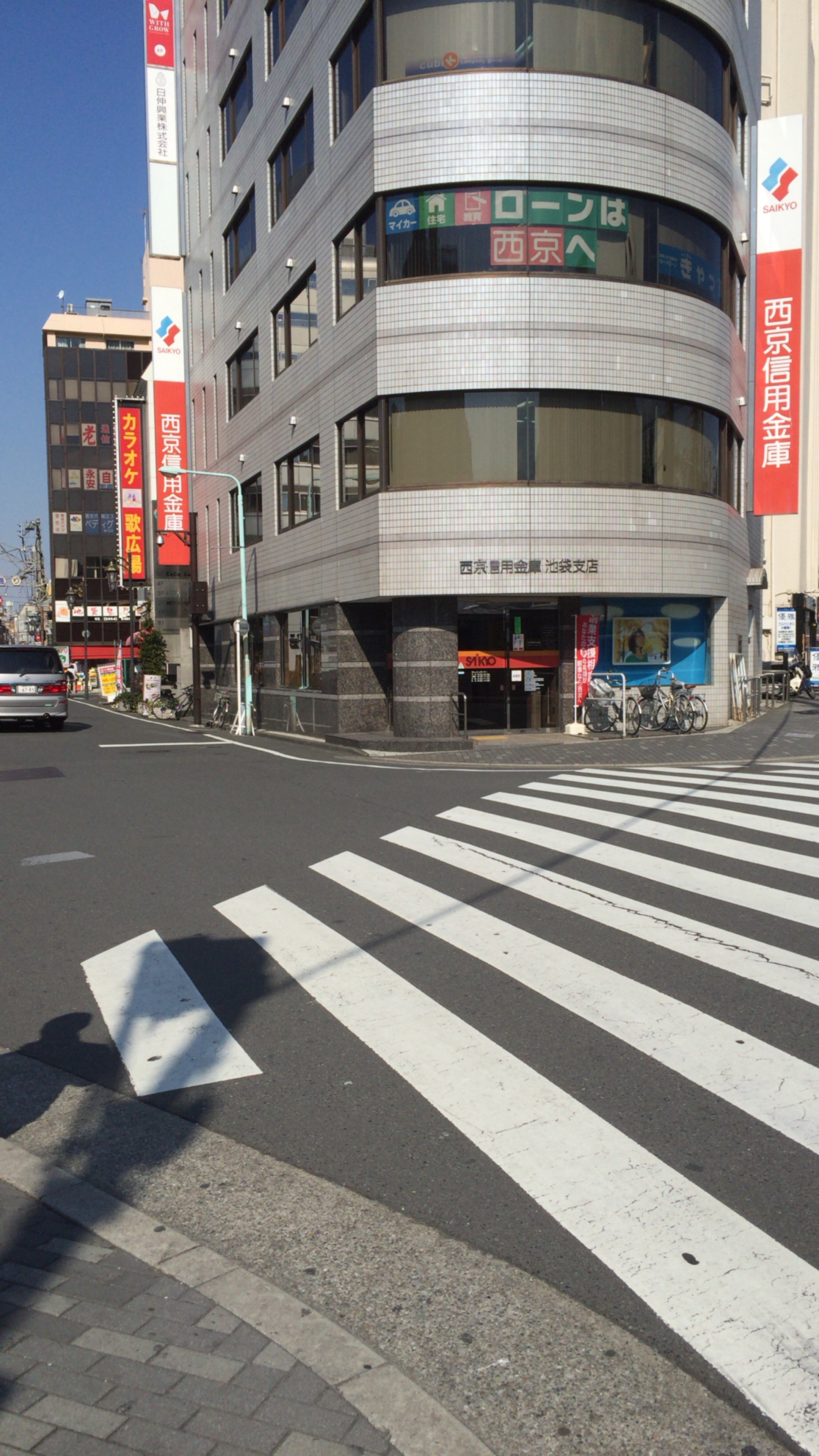 2.そのまま直進して左に西京信用金庫が見えるところまできたら駐車場の先を左折します。